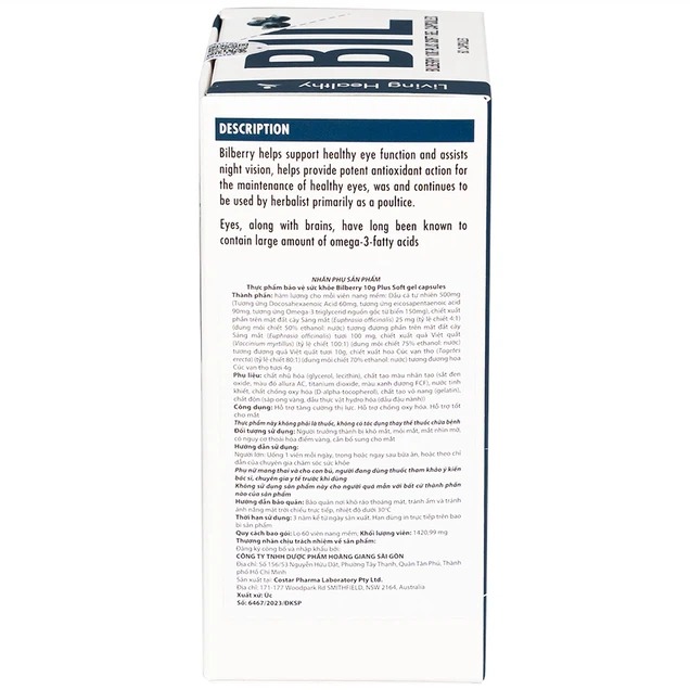 Living Healthy Bilberry 10000mg Plus Lutein là thực phẩm chức năng bổ mắt được nghiên cứu và sản xuất bởi thương hiệu Living Healthy đến từ Úc. Sản phẩm có chứa các thành phần quan trọng cho bảo vệ đôi mắt như: