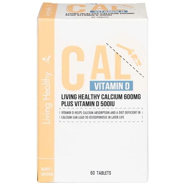 Viên uống bổ sung canxi Living Healthy Calcium 600mg Plus Vitamin D 500IU là sản phẩm của thương hiệu Living Healthy đến từ Úc. Sản phẩm có chứa 600mg canxi và 500IU vitamin D3. Giúp duy trì hệ xương chắc khoẻ của hãng dược phẩm Living Healthy đến từ Úc.